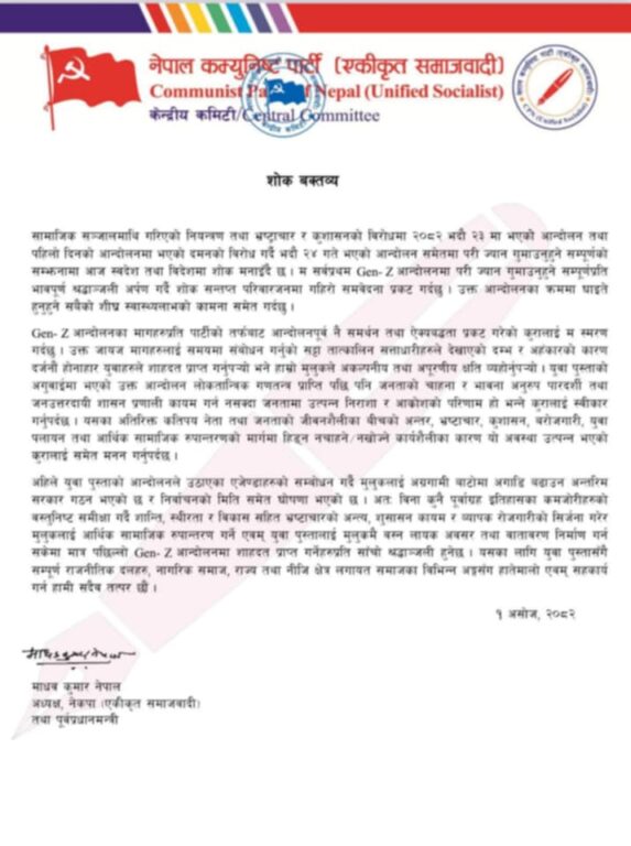 काठमाडौं, १ असोज । नेकपा कम्युनिष्ट पार्टी (एकीकृत समाजवादी) अध्यक्ष तथा पूर्व प्रधानमन्त्री माधवकुमार नेपालले जेन–जी आन्दोलनमा परी ज्यान गुमाएकाहरुप्रति श्रद्धाञ्जली अर्पण गरेका छन् । जेन जी आन्दोलनका मागहरुप्रति आफ्नो पार्टीले आन्दोलनपूर्व नै समर्थन तथा ऐक्यबद्धता प्रकट गरेको स्मरण गराएका छन् ।