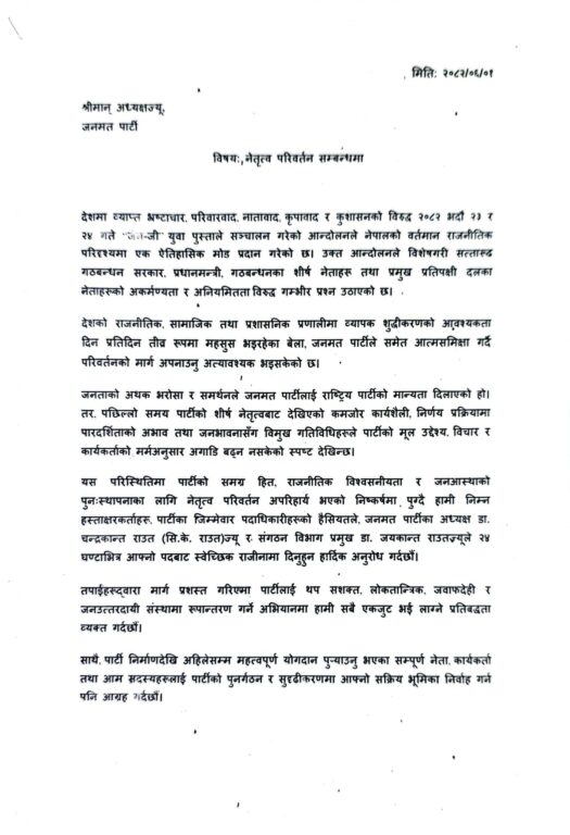 यसरी अल्टिमेटम दिनेमा जनमत युवा संघका संयोजक सञ्जयकुमार यादव, स्वास्थ्यकर्मी जनमत संघका अध्यक्ष सिके सिंह, वरिष्ठ प्रदेश इन्चार्ज सुदूरपश्चिम राजाराम चौधरी र राष्ट्रिउ परिषद तथा केन्द्रीय सदस्य विक्रम बहादुर बमले आज सामूहिक हस्ताक्षर गरी नेतृत्वले मार्ग प्रशस्त गरेका हुन् । उनीहरुले पछिल्लो समय पार्टी नेतृत्वको कमजोर प्रदर्शन देखिएको आरोप लगाएका छन् । उनीहरुले संगठन विभाग प्रमुख डा. जयकान्त राउतको पनि राजीनामा मागेका छन् । जयकान्त सिके राउतका दाइ हुन् ।