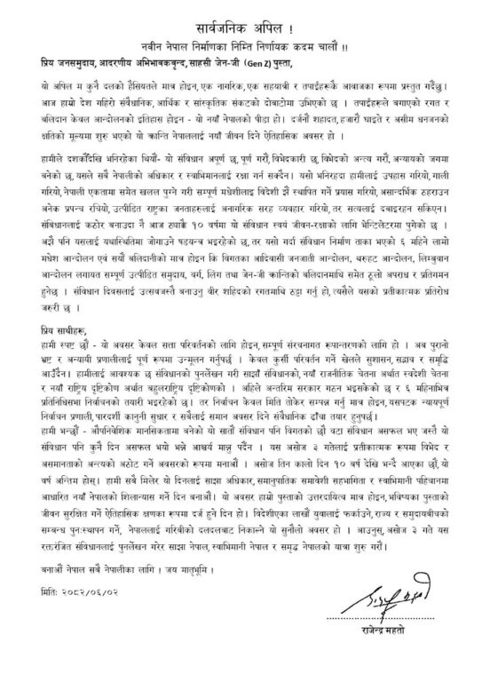 काठमाडौं, २ असोज । राष्ट्रिय मुक्ति पार्टी नेपालका अध्यक्ष राजेन्द्र महतोले नेपाल अहिले गहिरो संवैधानिक, आर्थिक र सांस्कृतिक संकटको दोबाटोमा उभिएको टिप्पणी गरेका छन् । उनले नवीन नेपाल निर्माणको निम्ति निर्णायक कदम चाल्न सार्वजनिक अपिल गर्दै आम जनसमूदाय र साहसी जेन-जी पुस्तालाई सम्बोधन गर्दै यस्तो बताएका हुन् ।