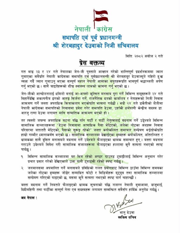 सभापतिमाथिको सांघातिक आक्रमणपछि पनि पार्टी र नेतृत्वलाई बदनाम गर्ने उद्देश्यले विभिन्न सामाजिक सञ्जालहरुमा देउवा निवासमा अत्याधिक पैसा भेटिएको, जलेका नोटका अंशहरु निवास परिसरमा जताततै भेटिएको, पैसाको सुरुङ रहेको जस्ता कपोकल्पित समाचार सम्प्रेषण भईरहेकोप्रति आफूहरुको गम्भीर ध्यानाकार्षण भएको सचिवालयले स्पष्ट पारेको छ । सामाजिक सञ्जालहरुमा देखाईएका दृष्यहरु कपोकल्पित, अतिरञ्जित र भ्रामकका साथै दुसित मनसायले बदनाम गर्ने उद्देश्यले फैलाईएका भ्रामक समाचार भनेको छ । देउवाको तर्फबाट स्वकिय सचिव भानु देउवाले आज विज्ञप्ती निकालेका हुन् ।