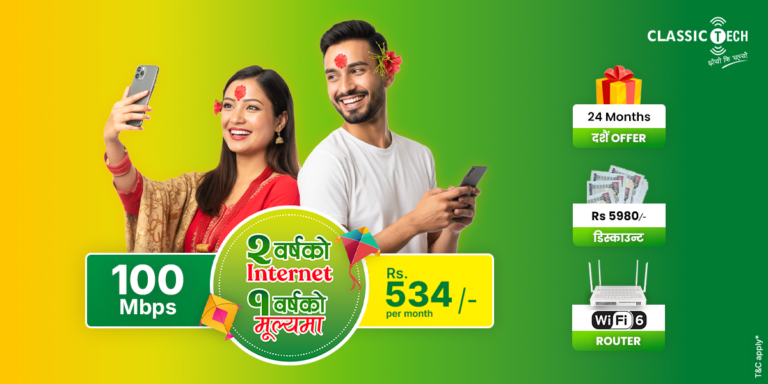 काठमाडौं । उत्कृष्ट नेटवर्क इन्टरनेट सेवा प्रदायक कम्पनी क्लासिक टेकले यस वर्षको दशैं विशेष अफर सार्वजनिक गरेको छ। यस अफर अन्तर्गत, ग्राहकहरूले ७० Mbps इन्टरनेट जडान गर्दा मात्र रु ४४३ प्रति महिनामा वाई फाई सिक्स राउटर पाउन सक्नेछन् ।अब १ वर्षको मूल्यमा २ वर्ष इन्टरनेट सेवा उपलब्ध हुने भएको छ।
