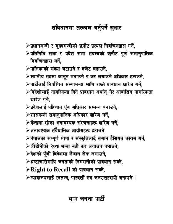 आजपाले संविधानमा सुधार गरेर प्रतिनिधिसभा र प्रदेश सभा सदस्यको छनौट पूर्ण समानुपातिक निर्वाचनद्वारा गरिनुपर्ने मत राखेको छ । आजपाले संविधानमा सुधार गर्नुपर्ने भनेर अघि सारेका विषयहरुमा पालिकाको संख्या घटाउने र बजेट बढाउने, स्थानीय तहमा कानून बनाउने र कर लगाउने अधिकार हटाउने, पार्टीलाई निर्वाचित संस्थाभन्दा माथि राख्ने प्रावधान खारेज गर्ने, विदेशीलाई नागरिकता दिने प्रावधान अर्थात् गैरआवासीय नागरिकता खारेज गर्ने भनेको छ ।