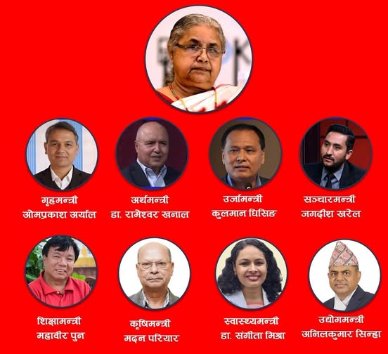 प्रधानमन्त्री सुशीला कार्कीले आइतबार अनिलकुमार सिन्हा, महावीर पुन, मदन परियार, संगीता कौशल मिश्रा र जगदीश खरेललाई मन्त्री नियुक्त गर्न राष्ट्रपति समक्ष सिफारिस गरेकी थिइन्।