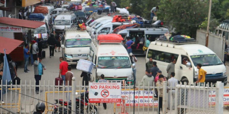 पछिल्ला दिनमा काठमाडौँ गोङ्गबुस्थित राष्ट्रिय बसपार्क नयाँबसपार्कमा समेत दसैँमा घर जाने यात्रुको चाप बढ्न थालेको छ । नयाँबसपार्क सञ्चालन गरेको लोत्से बहुउद्देश्यीय प्रालिका मानव संशाधन प्रमुख पङ्कज मल्लले अन्य समयको तुलनामा नयाँ बसपार्कबाट घर जाने यात्रुको सङ्ख्या बढेको छ । उनका अनुसार अन्य समय चार पाँच हजार हाराहारीमा यात्रु नयाँबसपार्कबाट बाहिरिने गरेकोमा अहिले उक्त सङ्ख्या बढेर दैनिक १५ हजारभन्दा बढी पुगेको छ । रासस