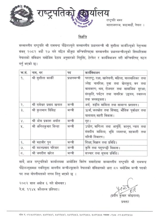 काठमाडौं, ६ असोज । प्रधानमन्त्री सुशीला कार्कीले दोस्रो पटक मन्त्रिपरिषद् विस्तार गरेकी छिन्। आज चार जना मन्त्रीहरुले शपथ लिएसँगै उनी नेतृत्वको मन्त्रिपरिषद्मा ७ जना मन्त्रीहरु भएका छन् । मन्त्रिपरिषद्को पहिलो वरियतामा अर्थमन्त्री रामेश्वरप्रसाद खनाल नै छन् ।