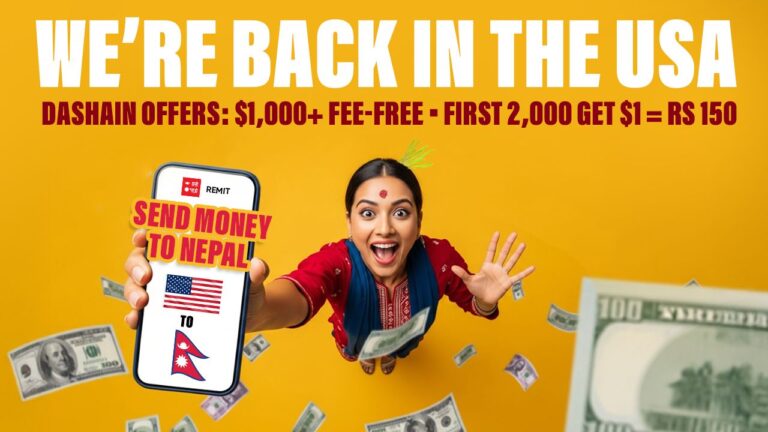 दसैंको शुभ अवसरमा, हाम्रो पात्रो रेमिट मार्फत प्रयोगकर्ताहरूले १ हजार अमेरिकी डलर वा सोभन्दा बढी रकम ट्रान्सफर गर्दा कुनैपनि अतिरिक्त शुल्क तिर्नु पर्ने छैन। दसैंमा परिवार र आफन्तलाई आर्थिक साथ दिन चाहने पहिलो ५ हजार नयाँ प्रयोगकर्ताहरूले आफ्नो पहिलो ट्रान्सफरमा १ अमेरिकी डलर बराबर १५० को विशेष विनिमय दर प्राप्त गर्नेछन्।