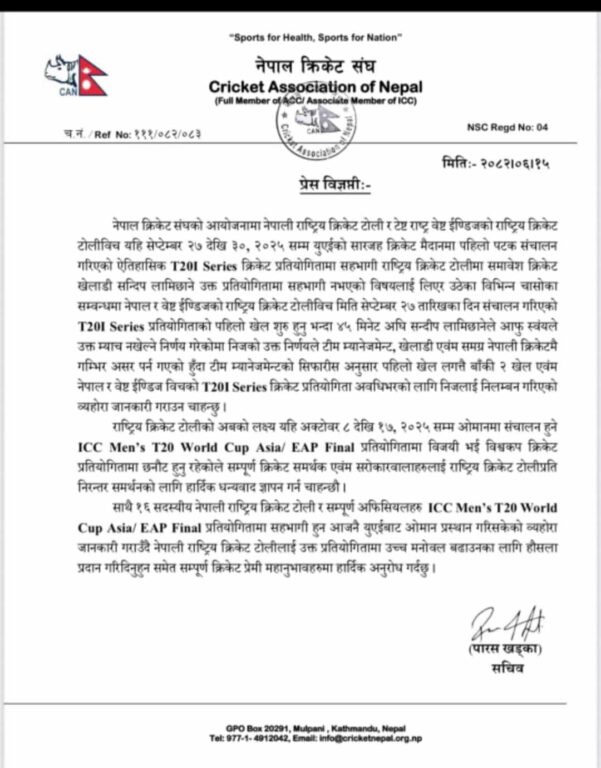 काठमाडौं, १५ असोज । नेपाल क्रिकेट संघले हालै युएईमा भएको वेष्ट इन्डिजविरुद्धको T20I खेलमा सन्दीप लामिछानेलाई निलम्बनमा राखिएको खुलाएको छ । क्यानका सचिव पारख खड्काले आज (बुधबार) एक विज्ञप्ति जारी गर्दै यस्तो स्पष्ट पारेका हुन् ।
