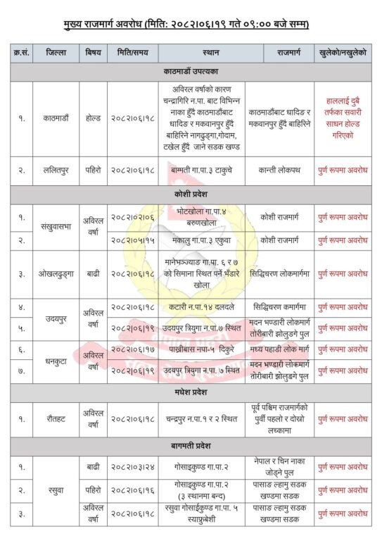 काठमाडौं उपत्यका ट्राफिक प्रहरी कार्यालयका अनुसार नारायणगढ-मुग्लिन सडक खण्ड, बीपी राजमार्ग, कुलेखाने-सिस्नेरी-काठमाडौं सडक , अरनिको राजमार्ग, हेटौँडा-भैँसे-नौबिसे सडक, धार्के–सितापाईला सडक र कान्तिलोकपथ लगायतका प्रमुख राजमार्गमा गएको पहिरोको कारण पछिल्लो २४ घण्टादेखि राजधानी आउने मुख्य सडक बन्द रहेका छन् ।