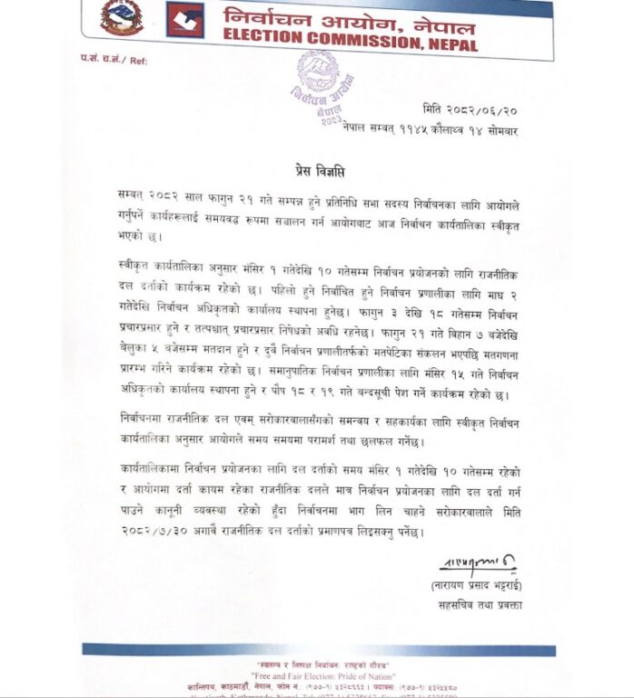 काठमाडौं, २० असोज । निर्वाचन आयोगले आगामी फागुन २१ गते हुने प्रतिनिधि सभा निर्वाचन समयवद्ध रुपमा सञ्चालनको लागि निर्वाचन कार्यतालिका स्वीकृत गरेको छ । आज (सोमबार) बसेको आयोगको बैठकले निर्वाचन कार्यतालिका स्वीकृत गरेको हो ।