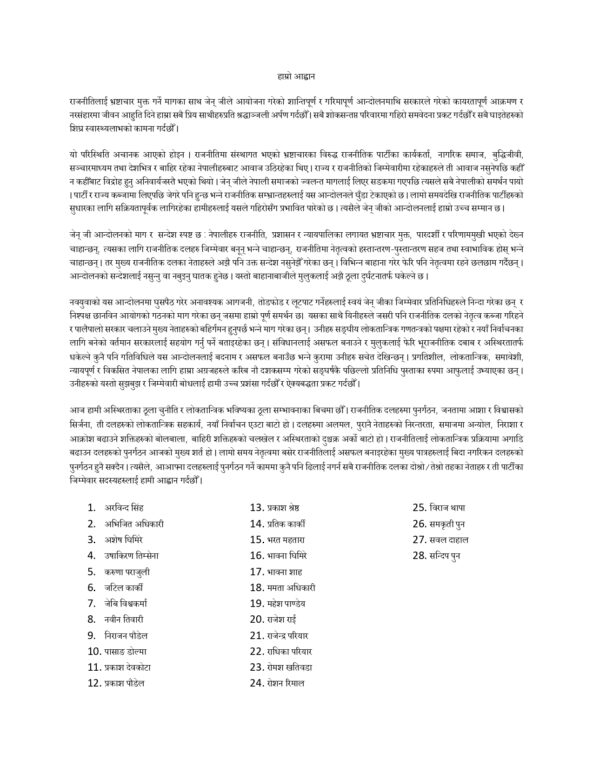 राजनीतिलाई भ्रष्टाचारमुक्त गर्ने मागका साथ जेनजीले आयोजना गरेको शान्तिपूर्ण र गरिमापूर्ण आन्दोलनमाथि सरकारले गरेको कायरतापूर्ण आक्रमण र नरसंहारमा जीवन आहुति दिने सबैप्रति उनीहरुले श्रद्धाञ्जली अर्पण गरेका छन् । जेनजीले नेपालमा राजनीतिमा नेतृत्वको हस्तान्तरण–पुस्तान्तरण सहज तथा स्वाभाविक होस भन्ने चाहेको पनि उनीहरुले उल्लेख गरेका छन् ।