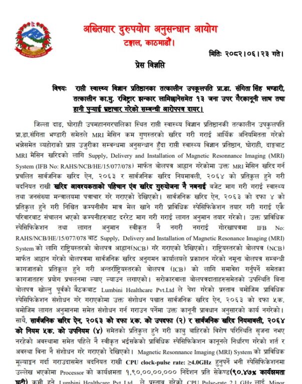 काठमाडौं, २३ असोज । अख्तियार दुरुपयोग अनुसन्धान आयोगले राप्ती स्वास्थ्य विज्ञान प्रतिष्ठानकी पूर्व उपकुलपति प्रा.डा. संगिता सिंह भण्डारीसहित १३ जनाविरुद्ध भ्रष्टाचार मुद्दा दायर गरेको छ । आयोगले स्वास्थ्य सामग्री खरिदमा घोटाला भएको भन्दै भण्डारीसहित १३ जनाविरुद्ध विशेष अदालतमा भ्रष्टाचार मुद्दा दायर गरेको हो। विपी कोइराला स्वास्थ्य विज्ञान प्रतिष्ठानमा प्राध्यापक रहेकी भण्डारी भ्रष्टाचार मुद्दा दायर भएसँगै निलम्बनमा परेकी छिन्।