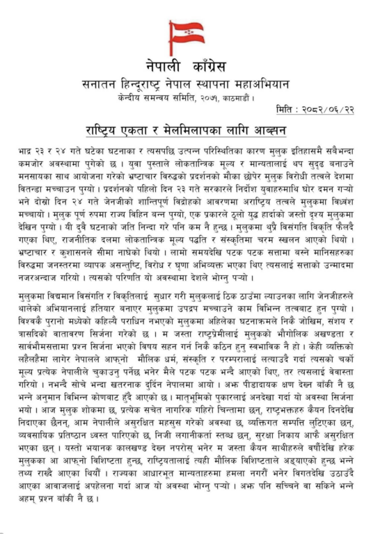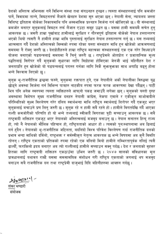 काठमाडौं, २३ असोज । सनातन हिन्दूराष्ट्र नेपाल स्थापना महाभियानका संयोजक शंकर भण्डारीले मुलुक इतिहासमै सबैभन्दा कमजोर अवस्थामा पुगेको टिप्पणी गरेका छन् । युवा पुस्ताले लोकतान्त्रिक मूल्य र मान्यतालाई थप सुदृढ बनाउने मनसायका साथ आयोजना गरेको भ्रष्टाचारविरुद्धको प्रदर्शनको मौका छोपेर मुलुकविरोधी तत्वले देशमा वितण्डा मच्चाएको पनि उनको दाबी छ । भदौ २३ गते निर्दोष युवाहरुमाथि सरकारले घोर दमन गरेको र भदौ २४ गते जेनजीको शाीन्तपूर्ण विद्रोहको आवरणमा अराष्ट्रिय तत्वले मुलुकमा विध्वंश मच्चाएको उनको भनाई छ ।