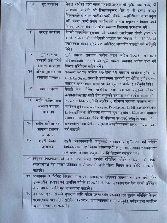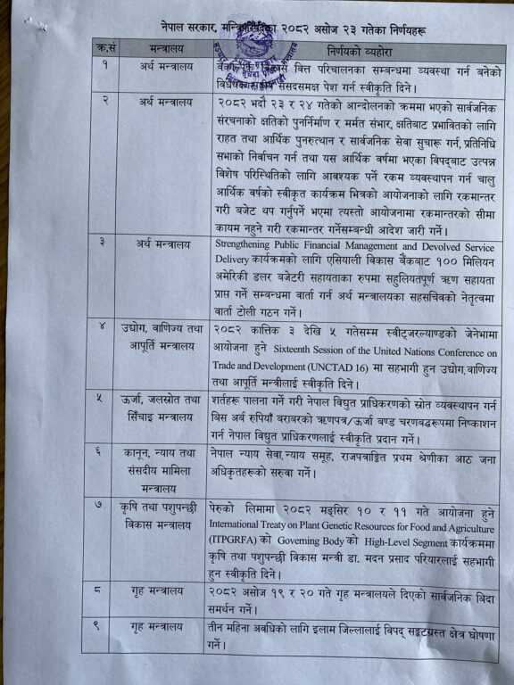 त्यसैगरी, नेपाल विद्युत प्राधिकरणको स्रोत व्यवस्थापन गर्न २० अर्ब रुपैयाँ बराबरको ऋण पत्र/ऊर्जा बण्ड चरणवद्धरुपमा निष्काशन गर्न स्वीकृति प्रदान गरिएको छ । त्यस्तै, तीन महिना अवधिका लागि इलाम जिल्लालाई विपद् संकटग्रस्त क्षेत्र घोषणा पनि गरिएको छ ।