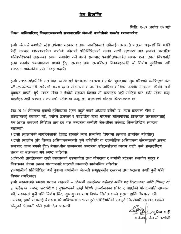 कर्णाली जेनजी संयोजक शाहीले भनेकी छन्, ‘टासी ल्हाजोमको नागरिकताको विवाद रहेकाले त्यस सम्बन्धि विषयमा तत्काल छानबिन गरियोस् ।’