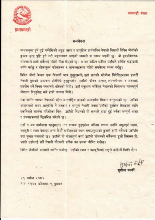 बन्धकमुक्त हुने दुई वर्षदेखिको अटुट आशा र सामूहिक प्रार्थनाबीच नेपाली विद्यार्थी विपिन जोशीको दुःखद् मृत्यु पुष्टि हुनेगरी मङ्गलबार आएको खबरले आफू स्तब्ध भएको उल्लेख गर्दै समवेदनमा भनिएको छ, “यो हृदयविदारक समाचारले सबैलाई गहिरो पीडा दिएको छ, म यस कठिन घडीमा उहाँप्रति हार्दिक श्रद्धाञ्जली अर्पण गर्दछु, शोकाकुल परिवारजन र आफन्तहरूमा गहिरो समवेदना व्यक्त गर्दछु ।”