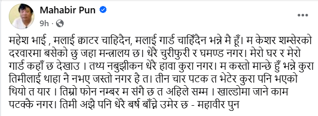 तर, बस्नेतको सोही भिडियो सेयर गर्दै शिक्षामन्त्री पुनले काउन्टर जवाफमा ‘मेरो घर र गार्ड कहाँ छ रु देखाउ’ भन्दै प्रश्न गरेका छन् । उनले बस्नेतलाई धेरै चुरीफुरी र घमण्ड नगर्न पनि भनेका छन् । त्यस्तै, तथ्य नबुझी धेरै हावामा कुरा नगर्न पनि पुनले बस्नेतलाई भनेका छन् ।