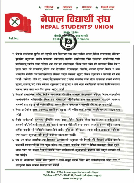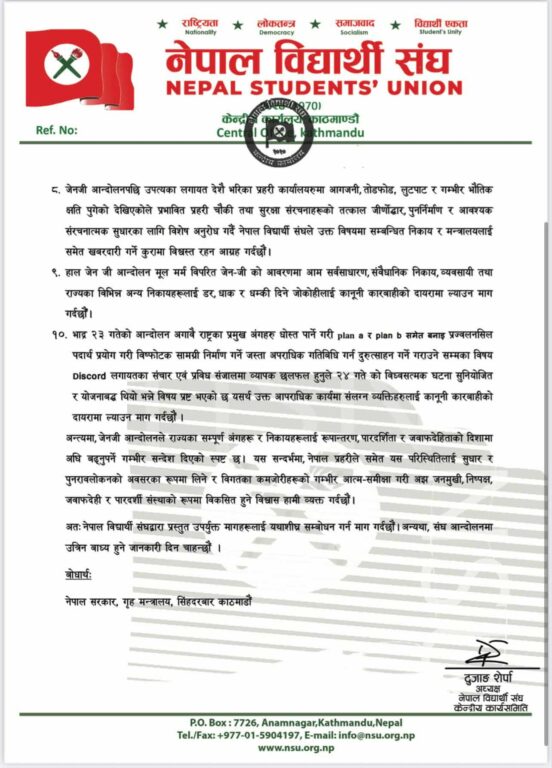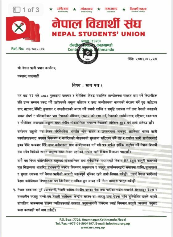 काठमाडौं, ३१ असोज । नेपाली कांग्रेसको भातृ संगठन नेपाल विद्यार्थी संघ (नेविसंघ) ले जेनजी आन्दोलनको क्रममा पार्टी सभापति शेरबहादुर देउवा र उनकी पत्नी डा. आरजु राणा देउवामाथि भएको साङ्घातिक आक्रमणमा संलग्नहरुलाई कारबाहीको माग गरिएको छ । अध्यक्ष दुजाङ शेर्पाको नेतृत्वमा गएको नेविसंघको टोलीले नेपाल प्रहरीका प्रहरी महानिरीक्षक चन्द्रकुबेर खापुङलाई १० बुँदे माग पत्र बुझाउँदै यस्तो माग गरेको हो ।