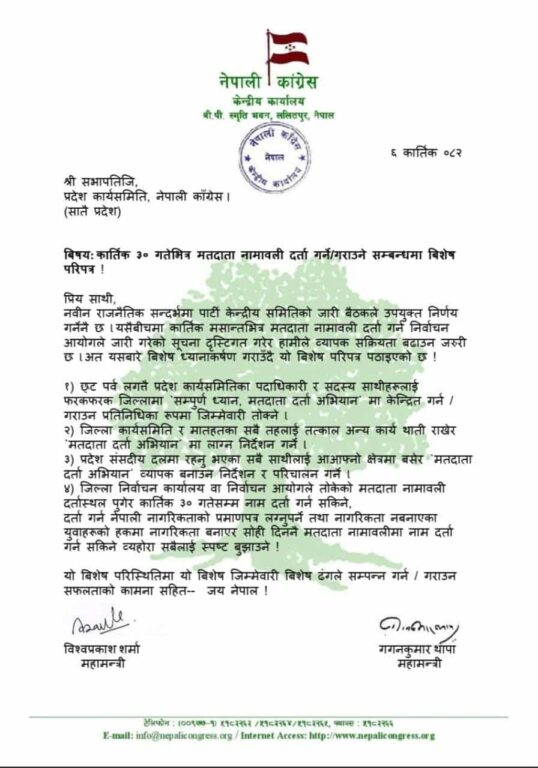 काठमाडौं, ७ कार्तिक । नेपाली कांग्रेसका महामन्त्रीद्धय विश्वप्रकाश शर्मा र गगन थापाले कार्तिक ३० गतेभित्र सबै योग्य नेपाली नागरिकलार्य मतदाता नामावलमा नाम दर्ता गराउन पहल गर्न आग्रह गरेका छन् । उनीहरुले एक परिपत्र जारी गरी पार्टी पँक्तिलाई मतदाता नामावलीमा नाम दर्ता गराउनको लागि छठलगत्तै त्यस काममा लाग्न भनेका हुन् ।