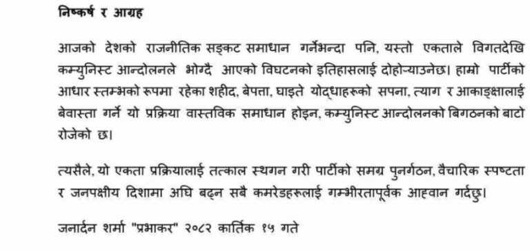 काठमाडौं, १५ कार्तिक । नेकपा (माओवादी केन्द्र) का सचिवालय सदस्य जनार्दन शर्मा ‘प्रभाकर’ ले तत्काल माधव नेपाल नेतृत्वको नेकपा (एकीकृत समाजवादी) पार्टीसँग एकता गर्न नहुने मत राखेका छन् ।