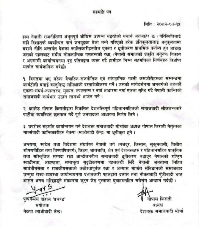 माओवादी केन्द्रका अध्यक्ष पुष्पकमल दाहाल ‘प्रचण्ड’ र मोर्चाका अध्यक्ष किराँतीले सहमती पत्र सार्वजनिक गर्दै किराती नेतृत्वको मोर्चा माओवादी केन्द्रमा समाहित भएको जानकारी दिएका छन् ।