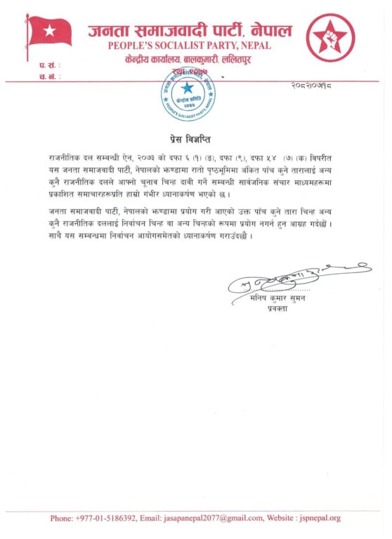 रास्वपाका प्रवक्ता मनिष कुमार सुमनले आज एक विज्ञप्ती निकाल्दै आफ्नो दलको झण्डामा प्रयोग गरी आएको उक्त पाँच कुने तारा चिन्ह अन्य कुनै राजनीतिक दललाई निर्वाचन चिन्ह वा अन्य चिन्हको रुपमा प्रयोग नगर्न अनुरोध गरेका छन् ।