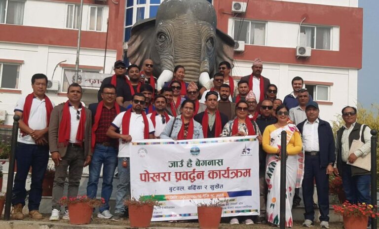‘जाउँ है बेगनास पोखरा’ कायक्रमअन्तर्गत बुटबल, बर्दिया, सुर्खेतलगायत जिल्लाका पर्यटन व्यवसायीसँग छलफल गरी उक्त टोली आज पोखरा फर्किएको होटेल तथा रेष्टुरेन्ट एसोसिएसन, लेखनाथका अध्यक्ष वीरभद्र कँडेलले जानकारी दिए ।
