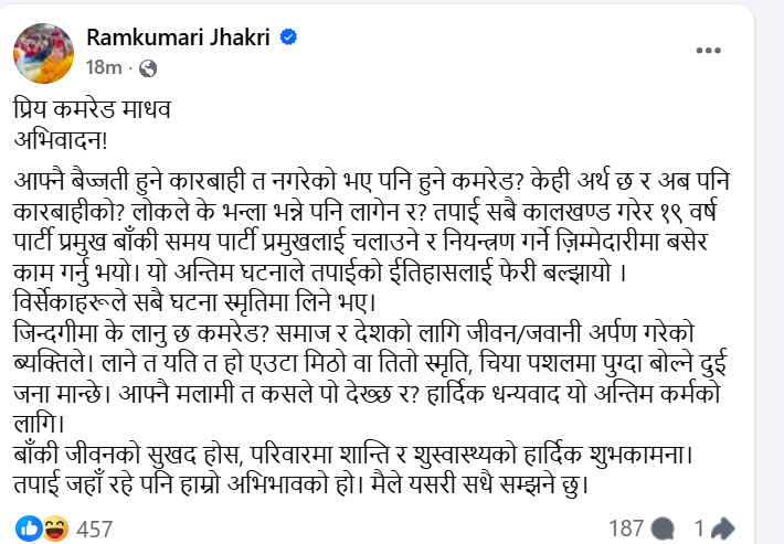 उनले लेखेकी छिन् ‘आफ्नै बैज्जती हुने कारबाही त नगरेको भए पनि हुने कमरेड? केही अर्थ छ र अब पनि कारबाहीको? लोकले के भन्ला भन्ने पनि लागेन र? तपाई सबै कालखण्ड गरेर १९ वर्ष पार्टी प्रमुख बाँकी समय पार्टी प्रमुखलाई चलाउने र नियन्त्रण गर्ने ज़िम्मेदारीमा बसेर काम गर्नु भयो। यो अन्तिम घटनाले तपाईको ईतिहासलाई फेरी बल्झायो । विर्सेकाहरूले सबै घटना स्मृतिमा लिने भए।’