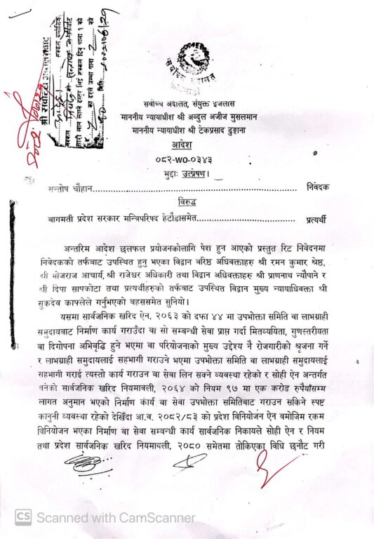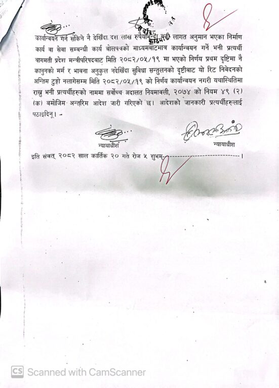 ‘दश लाख रुपैयाँभन्दा बढी लागत अनुमान भएका निर्माण कार्य वा सेवा सम्बन्धी कार्य बोलपत्रको माध्यमबाटमात्र कार्यान्वयन गर्ने भनी प्रत्यर्थी बागमती प्रदेश मन्त्रीपरिषदबाट मिति २०८२/०५/१९ मा भएको निर्णय प्रथम दृष्टिमा नै कानुनको मर्म र भावना अनुकुल नदेखिँदा सुविधा सन्तुलनको दृष्टीबाट यो रिट निवेदनको अन्तिम टुङ्गो नलागेसम्म मिति २०८२/०५/१९ को निर्णय कार्यान्वयन नगरी यथास्थितिमा राख्नु भनी प्रत्यर्थीहरुको नाममा सर्वोच्च अदालत नियमावली, २०७४ को नियम ४९ (२) (क) बमोजिम अन्तरिम आदेश जारी गरिएको छ,’– आदेशमा भनिएको छ ।