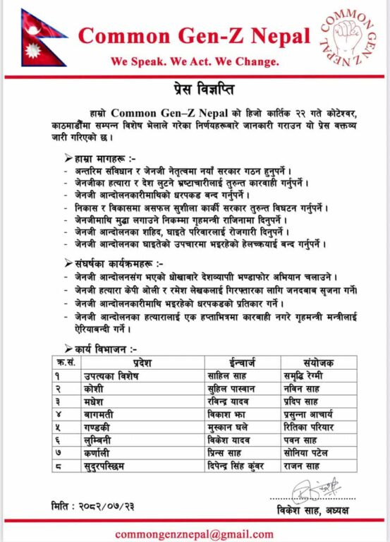 COMMON GEN-Z NEPAL ले सातै प्रदेशमा इन्चार्ज र संयोजकको जिम्मेवारी तोक्यो