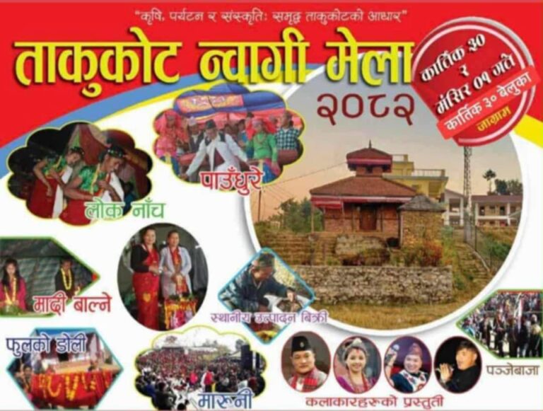 गोरखा, २७ कात्तिक। गोरखा जिल्ला बारपाक सुलीकोट गाउँपालिका–६, ताकुकोटस्थित माईभगवती मन्दिर परिसरमा यस वर्षको ताकुकोट न्वागी मेला–२०८२ यही कात्तिक ३० गतेदेखि सुरुहुने भएको छ ।