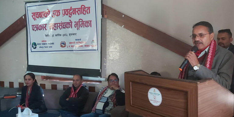 वाग्मती गाउँपालिका– २ सँगको सहकार्यमा नेपाल पत्रकार महासङ्घ ललितपुर शाखाले आज यहाँ आयोजना गरेको ‘सूचनाको हक प्रवर्द्धनमा पत्रकार महासङ्घको भूमिका कार्यक्रम’मा नेपाल पत्रकार महासङ्घका उपाध्यक्ष उमीदप्रसाद बागचन्दले सूचनाको हकको प्रयोगमा पत्रकार जिम्मेवार हुनुपर्ने बताए । देश र जनतालाई केन्द्रमा राखेर काम गर्नुपर्नेमा उनको जोड थियो ।
