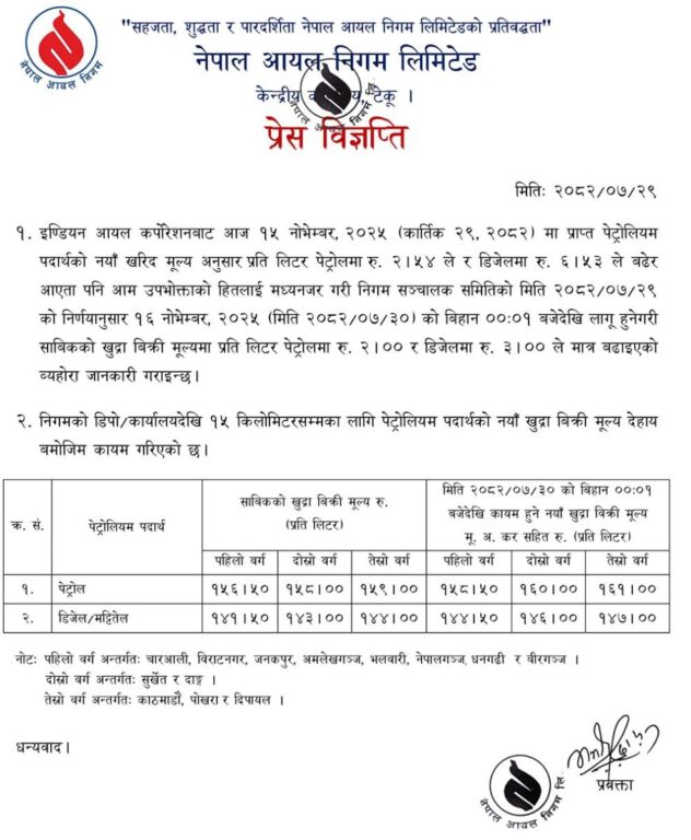 काठमाडौं, कार्तिक ३० । नेपाल आयल निगमले आजदेखि लागू हुनेगरी पेट्रोलियम पदार्थको मूल्य वृद्धि गरेको छ। निगमले समायोजन गरेको पेट्रोल, डिजेल र मट्टीतेलको नयाँ मूल्य अनुसार आजदेखि पेट्रोल प्रतिलिटर २ रुपैयाँ र डिजेल तथा मट्टीतेल प्रतिलिटर ३ रुपैयाँले बढेको छ।