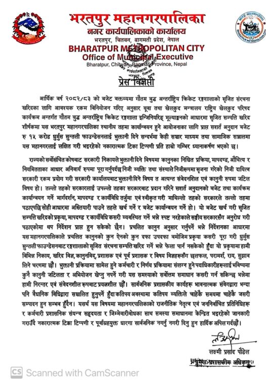 काठमाडौं, ५ मंसिर । चितवनको भरतपुर महानगरपालिकाले प्रचलित कानुनको कुनै ऐनको कुन दफा, उपदफाबमोजिम कानूनी प्रक्रिया पूरा गरी धुर्मुस सुन्तली फाउन्डेसनबाट रङ्गशालाको सृजित संरचना सम्पत्ति खरिद गर्ने भन्ने फेला पार्न नसकिएको बताएका छ । महानगरले आज आज एक विज्ञप्ति जारी गर्दैै प्रकृयाका सन्दर्भमा विभिन्न निकाय, खरिद विज्ञ, कानुनविद्, प्रशासक एवं पूर्व प्रशासक र विषय विज्ञहरूसँग छलफल, परामर्श, राय, सुझाव लिने चरणमा रहेको बताएको छ ।