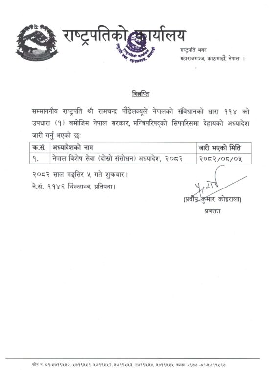 सरकारको सिफारिसमा शुक्रबार राष्ट्रपति रामचन्द्र पौडेलले नेपाल विशेष सेवा ऐन दोस्रो संशोधन अध्यादेश, २०८२ जारी गरेका हुन् ।