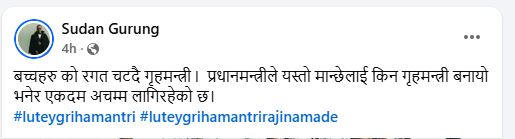 उनले फेशबुकमा ‘गृहमन्त्रीले काकालाई डिआईजी बनाउन सशस्त्र प्रहरकिो दरबन्दी संशोधन ठूलो विवाद सुरु’ लेखिएको एउटा समाचार–तस्विर सेयर गर्दै यस्तो टिप्पणी गरेका हुन् ।