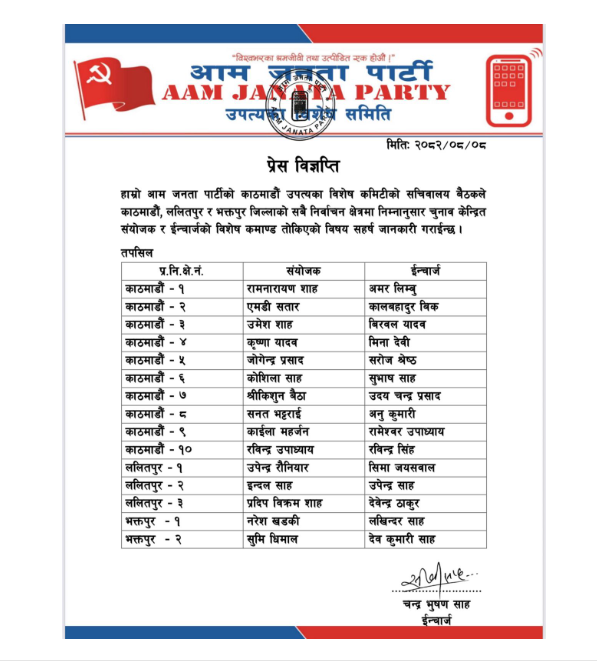 यसैगरी, काठमाडौं क्षेत्र नं. ७ इन्चार्ज उदयचन्द्र प्रसाद, संयोजकमा श्रीकिशुन बैठा, क्षेत्र नं. ८ मा इन्चार्ज अनु कुमारी, संयोजकमा सनत भट्टराई, निर्वाचन क्षेत्र नं. ९ मा इन्चार्ज रामेश्वर उपाध्याय, संयोजकमा काइला महर्जन र क्षेत्र नं. १० मा इन्चार्ज रविन्द्र सिंह तथा संयोजकमा रविन्द्र उपाध्यायलाई जिम्मेवारी तोकिएको प्रवक्ता साहले जनाएका छन् ।