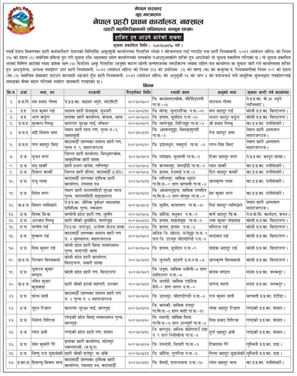 प्रधान कार्यालयले आज एक सार्वजनिक सूचनामार्फत गैरहाजिर प्रहरी सहायक निरिक्षक, प्रहरी जवान र प्रहरी कार्यालय सहयोगीको नाम, ठेगाना, गैरहाजिर भएको मिति लगायतको विवरण सार्वजनिक गर्दै बाटोको म्याद बाहेक सात दिनभित्र हाजिर हुन निर्देशन दिएको हो ।