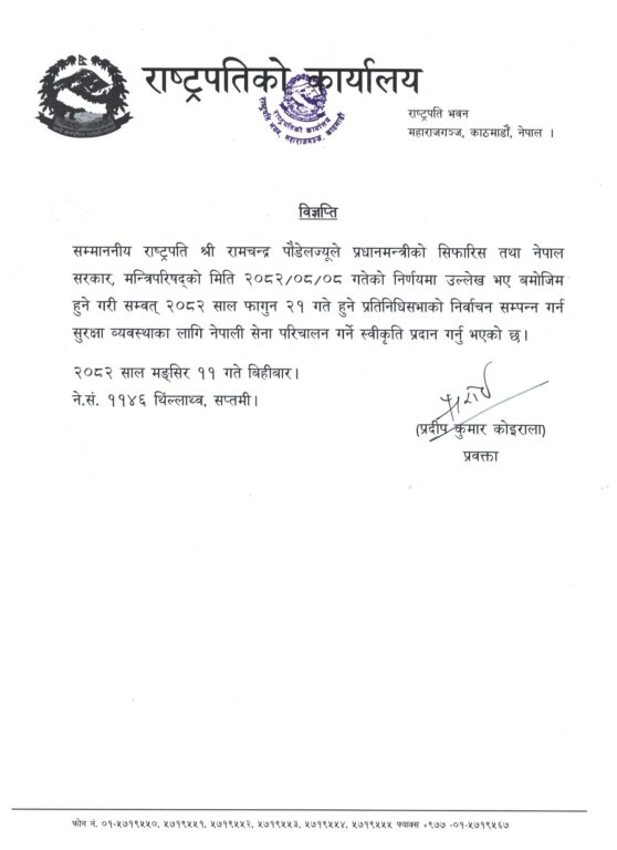 काठमाडौं, ११ मंसिर । राष्ट्रपति रामचन्द्र पौडेलले प्रतिनिधिसभाको निर्वाचन सम्पन्न गर्न सुरक्षा व्यवस्थाका लागि नेपाली सेना परिचालन गर्ने स्वीकृति प्रदान गरेका छन् ।