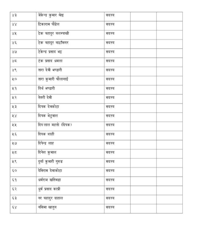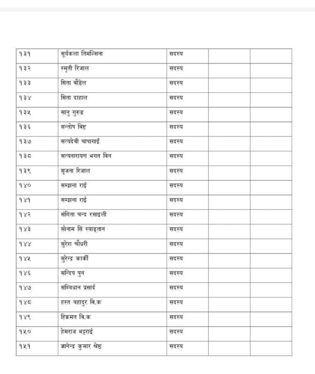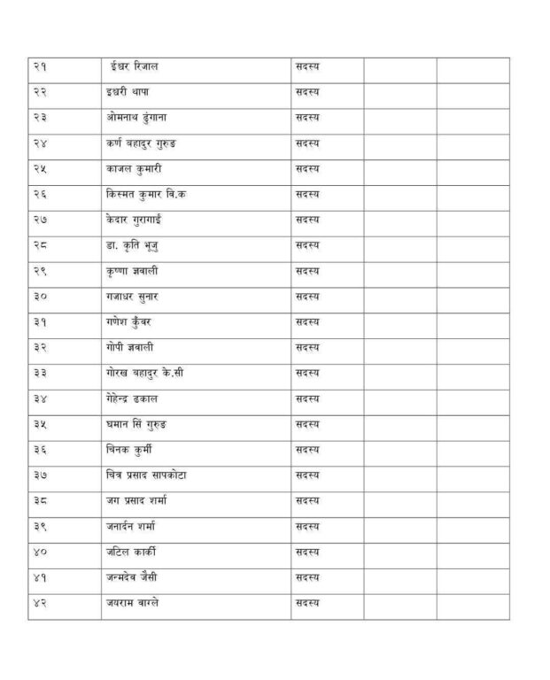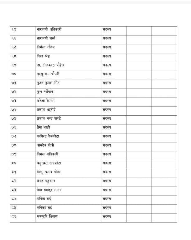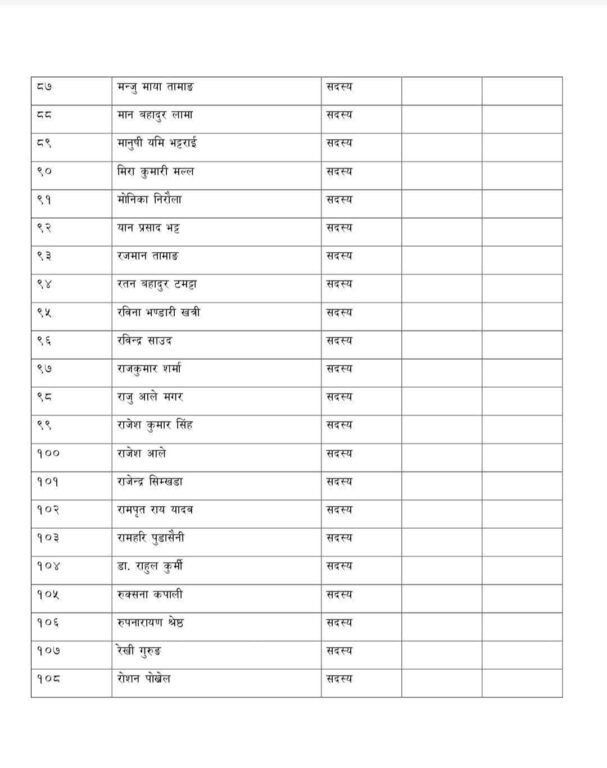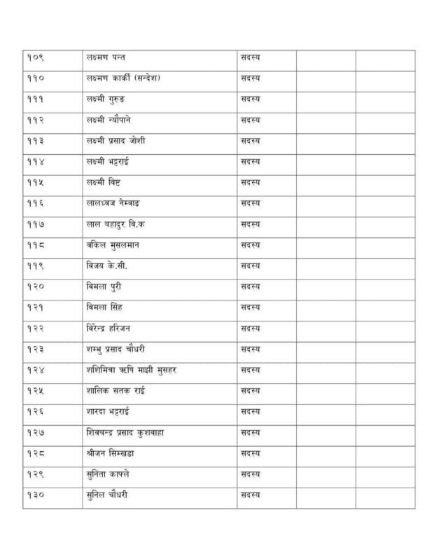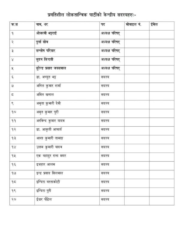 केन्द्रीय कमिटीको अध्यक्ष परिषदमा ओजस्वी भट्टराई, दुर्गा सोव, सन्तोष परियार, सुदन किराती र सुरेन्द्रप्रसाद जयसवालको नाम रहेको छ । बाँकी सबैलाई केन्द्रीय कमिटी सदस्य तोकिएको हो । सो पार्टीको संरक्षकसमेत रहेका पूर्वमन्त्री जनार्दन शर्माको नाम केन्द्रीय कमिटी सदस्यमा पनि राखिएको छ ।