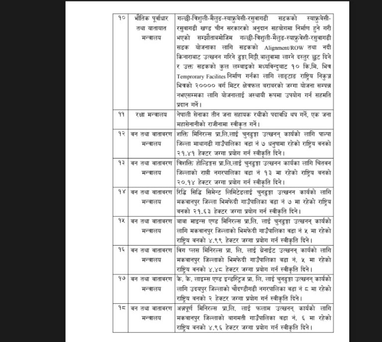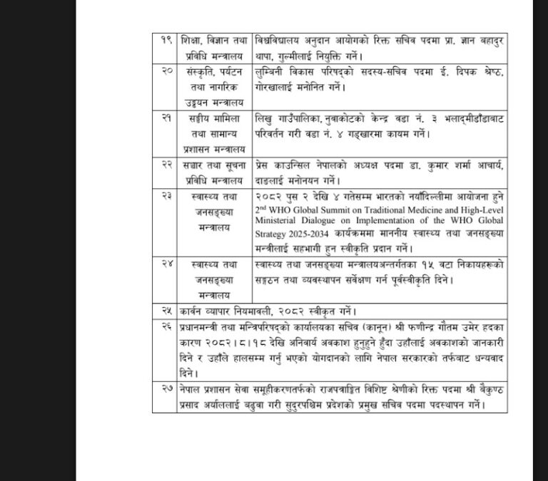 यस्तै, दोस्रो बुँदामा समेटिएको निर्णय राष्ट्रिय आर्थिक गणना सञ्चालनसम्बन्धी प्रशासनिक तथा आर्थिक मापदण्ड, २०८२ स्वीकृत गर्ने कुरा उल्लेख गरिएको छ । यस्तै, अर्थ मन्त्रालयका सचिव (राजश्व) भूपाल बराललाई कर्मचारी सञ्चय कोषको सञ्चालक समितिको अध्यक्ष पदमा नियुक्त गरिएको छ ।