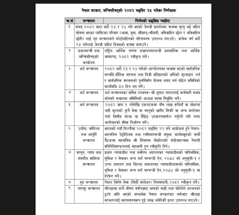 काठमाडौं, १६ मंसिर । मन्त्रिपरिषद्को हिजो (सोमबार) बसेको बैठकले गरेका विभिन्न २७ वटा निर्णय सार्वजनिक गरिएको छ । पहिलो निर्णयमा भदौ २३ र २४ गते भएको जेनजी प्रदर्शनका क्रममा मृत्यु भई सहिद घोषणा भएका व्यक्तिका परिवार (आमा, बुवा, श्रीमान÷श्रीमती, अविवाहित छोरा र अविवाहित छोरी) लाई गृह मन्त्रालयले फोटोसहितको परिचयपत्र उपलब्ध गराउने कुरा उल्लेख गरिएको छ । र, प्रत्येक वर्ष भदौ २३ गतेलाई जेनजी सहिद दिवसको रुपमा मनाउने पनि निर्णय यसमा समेटिएको छ ।