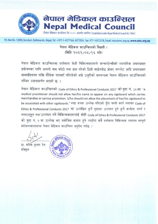 काउन्सिलका रजिष्ट्रार डा. सतिस कुमार देवले आज एक विज्ञप्ती निकालेर यस्तो ध्यानाकार्षण गराएका हुन् । देवले काउन्सिलको कोड अफ इथिक्स र प्रोफेश्नल कन्डक्ट्सको बुँदा नम्बर ५ (ए) नै उल्लेख गरेर यस्तो कार्यले आचार संहिताको उल्लंघन हुने जनाएका छन् ।