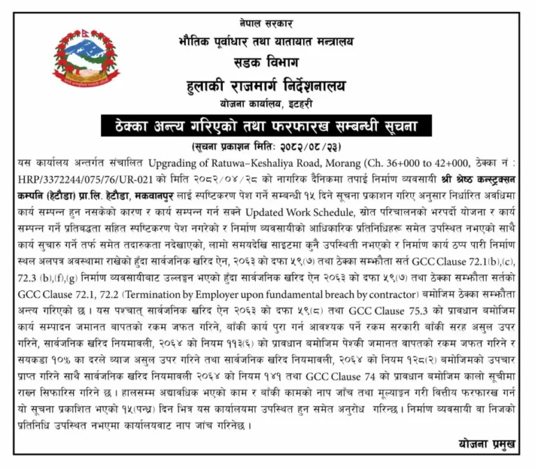 उक्त सडक कुनै ठाउँमा ४ र कुनै ठाउँमा ६ लेनमा स्तरोन्नति गर्ने गरी ठेक्का सम्झौता भएको थियो । निर्धारित अवधिमा कार्य सम्पन्न हुन नसकेको कारण र कार्य सम्पन्न गर्न सक्ने अद्यावधिक कार्यतालिका, स्रोत परिचालनको भरपर्दो योजना र कार्य सम्पन्न गर्ने प्रतिबद्धतासहित निर्माण व्यवसायीको आधिकारी प्रतिनिधि उपस्थित नभएको, पेश भएको स्पष्टीकरण चित्त बुझ्दो नभएको र कार्य सुचारु गर्नेतर्फसमेत तदारुकता नदेखाएको हुँदा सार्वजनिक खरिद ऐन तथा ठेक्का सम्झौता उल्लङ्गन गरिएपछि ठेक्का रद्द गरिएको आज सार्वजनिक सुचनामा जनाइएको छ ।