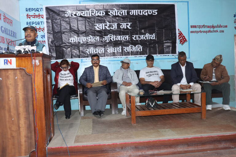 काठमाडौं, २४ मंसिर । सर्वोच्च अदालतले खोला मापदण्डसम्बन्धी गरेको फैसलाले काठमाडौं उपत्यकाका करिब ८४ हजार घर परिवार प्रभावित भइरहेको बताइएको छ । आज (बुधबार) सरोकारवालाहरुले रिपोर्टर्स क्लब नेपालमा पत्रकार सम्मेलन गरी सर्वोच्चको फैसलाका कारण खोला तथा नदीको मापदण्डबारे सर्वोच्चले गरेको फैसलाले निजी सम्पत्तिमाथिको हक हनन् भएको बताएका हुन् ।