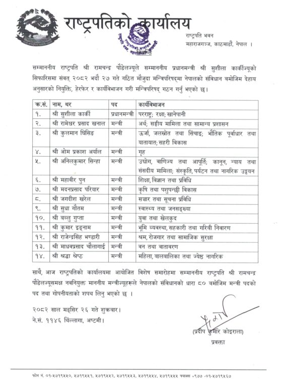 काठमाडौं, २६ मंसिर । प्रधानमन्त्री सुशीला कार्कीले मन्त्रिपरिषद् विस्तार गरेकी छिन् । प्रधानमन्त्रीको सिफारिशमा राष्ट्रपति रामचन्द्र पौडेलले आज मन्त्रिपरिषद् विस्तार गरेका हुन् । नवनियुक्त चार मन्त्रीहरु कुमार इङ्नाम, राजेन्द्रसिंह भण्डारी, माधवप्रसाद चौलागाईं र श्रद्धा श्रेष्ठले आज पद तथा गोपयिनताको शपथ लिएका छन् ।