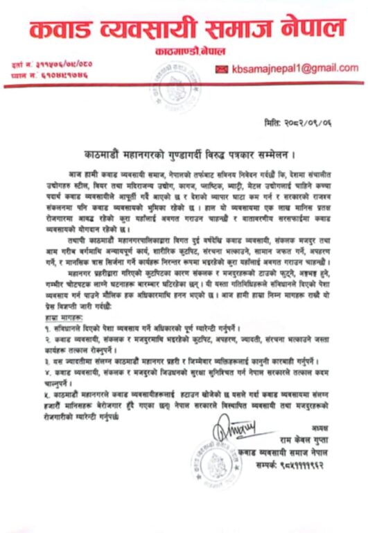 समाजका अध्यक्ष राम केवल गुप्ताले काठमाडौं महानगरले कवाड व्यवसायीहरुलाइृ हटाउन खोजेको भन्दै सरकारसमक्ष तत्काल व्यवसायी, संकलक र मजदुरको जिउधनको रक्षाको लागि कदम चाल्न माग गरे । उनकाअनुसार यो पेशामा हाल एक लाख मानिस प्रत्यक्ष रोजगारमा आवद्ध छन् ।