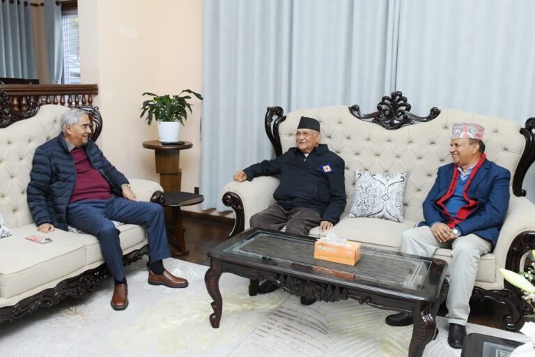 काठमाडौं, ७ पुष । नेकपा (एमाले) का नवनिर्वाचित अध्यक्ष केपी शर्मा ओली नेपाली कांग्रेसका सभापति शेरबहादुर देउवालाई भेट्न महाराजगञ्ज पुगेका छन् । ११औं महाधिवेशनबाट अध्यक्षमा भारी मतले विजयी भएपछि ओली देउवालाई भेट्न आज उनको निवासमा पुगेका हुन् । यसअघि पनि ओली दम्पत्तिले देउवा दम्पत्तिसँग भेट गरेको थियो ।
