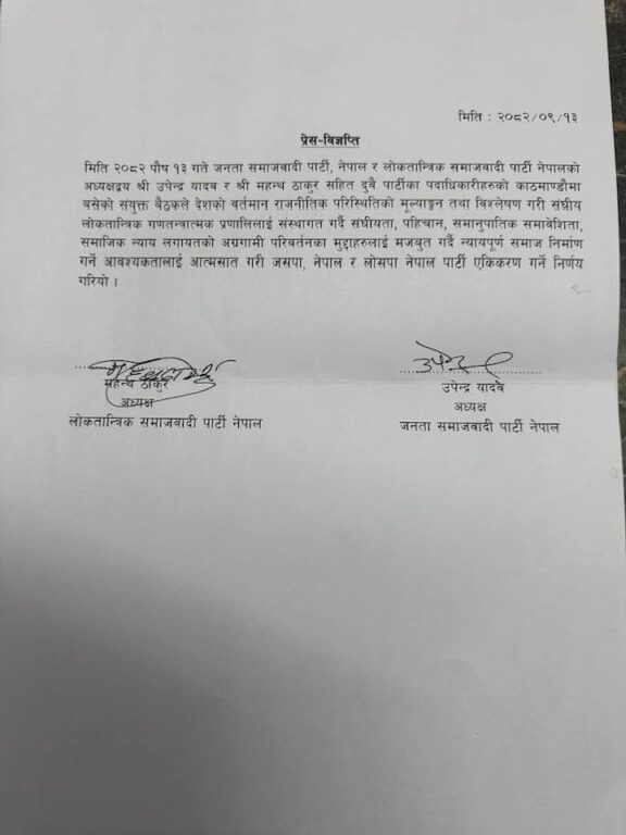 जसपा नेपाल र लोसपाबीच पार्टी एकीकरण गर्ने निर्णय