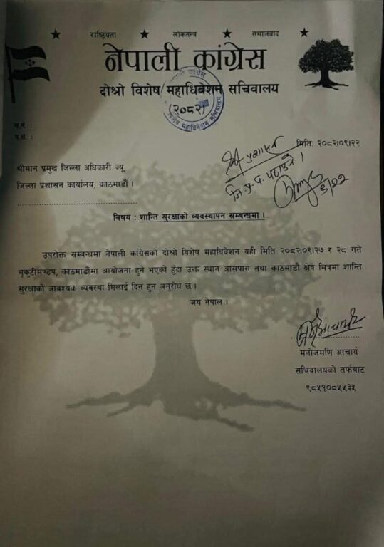 ‘नेपाली कांग्रेसको दोस्रो विशेष महाधिवेशन यही मिति २०८२ पुस २७ र २८ गते काठमाडौंको भृकुुटीमण्डपमा आयोजना हुने हुँदा उक्त स्थान आसपास तथा काठमाडौं क्षेत्रभित्रमा शान्ति सुरक्षाको आवस्यक व्यवस्था मिलाइदिनुहुन अनुरोध छ,’ पत्रमा भनिएको छ ।