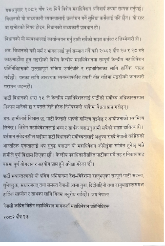 वर्तमान जटिल तथा विषम राजनीतिक परिस्थितिमा नेपाली कांग्रेसलाई थप सुदृढ, गतिशील र जनभावना अनुकूल बनाउन, समसामयिक नीति निर्माण गर्न तथा नयाँ ऊर्जा र नेतृत्वसहित पार्टी पुनर्निर्माण गर्न विशेष महाधिवेशन अपरिहार्य भएको ठहर गर्दै, पार्टी विधानको धारा १७ उपधारा (२) बमोजिम हामी २,४८८ जना महाधिवेशन प्रतिनिधिहरू (कुलको ५४.५८ प्रतिशत) ले २०८२ असोज २९ गते केन्द्रीय कार्यालयमा निवेदन दर्ता गराएका थियौं। सोही सिलसिलामा पुस ११ गते स्मरणपत्र र पुस २१ गते पुनः ध्यानाकर्षण गराएका थियौं।